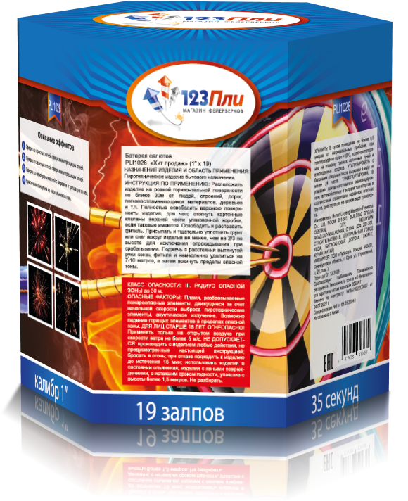 Этот фейерверк - абсолютный ХИТ ПРОДАЖ! Салют на 19 залпов входит в недорогую серию батарей от нашей компании "123 Пли". Качественные эффекты и невысокая цена позволяет устроить красочный, праздничный фейерверк в любом месте! Поверьте, великолепные пиротехнические эффекты этого фейерверка вызовут лишь восторг и желание повторить это шоу снова!