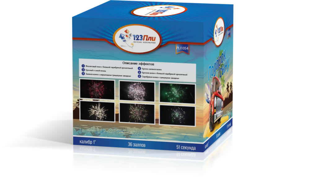 36 ослепительных залпов сделают ваш вечер незабываемым! Фиолетовый пион с большой серебряной хризантемой распустится в небе красивым узором. Далее взмоют в ночное небо красный и синий пионы, за ними последует зеленая волна с трещащими звездами! Кульминация данного фейерверка - серебряная волна с невероятным треском!