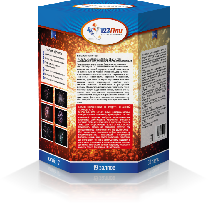 Расскажем вам про наши "Царские залпы". Салют с титулом "Царский" - это серьезно. Царям что попало не предложишь: вмиг лишишься головы с плеч! Поэтому можно не думая выбирать этот фейерверк для важных мероприятий и торжеств! Будьте уверены - он не поведет! 19 феерически красивых залпов калибра 1,2!