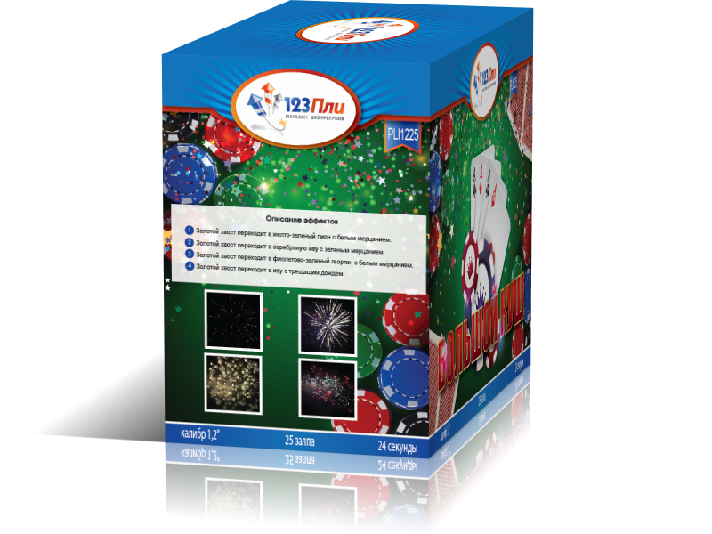 Мечтаете сорвать большой куш? Выиграть миллион в казино, а то и миллиард? Чтож, мечтать не вредно! Почувствовать вкус победы вы можете уже сегодня, ведь он ощущается в каждом из 25-х залпов фейерверка "Большой куш". Купите этот красочный салют, который поможет ощутить себя настоящим победителем и любимчиком фортуны!