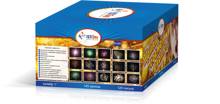145 залпов и 15 различных эффектов создадут в ночном небе настоящее шоу. Вы увидите мерцающие пальмы, разноцветные пионы, хризантемы, парчовые короны и множество других красочных фигур. А веерные залпы добавят особый шик и размах вашему празднику.