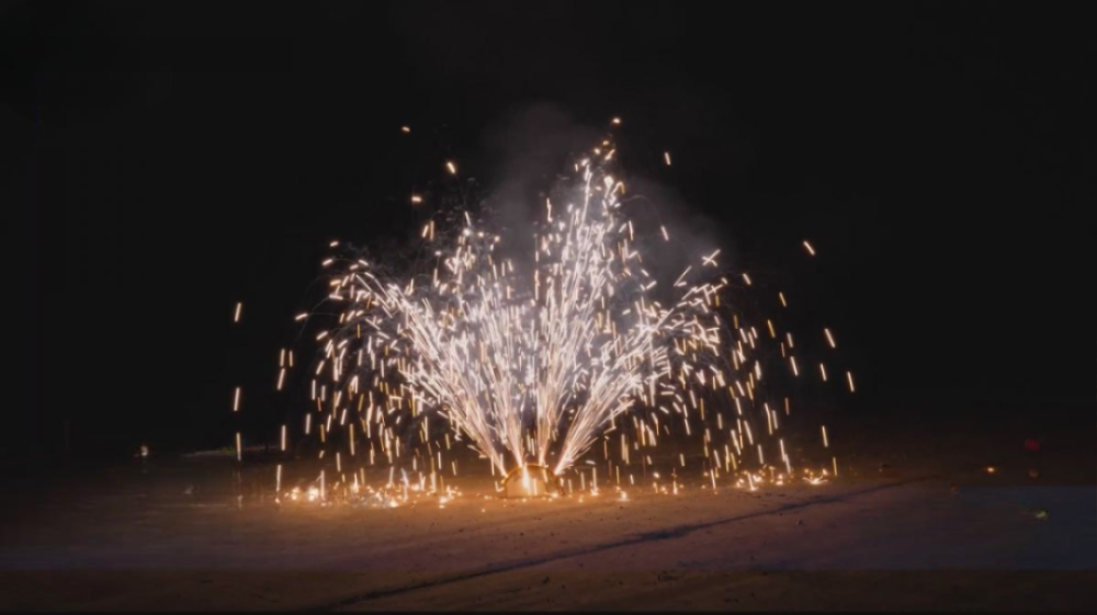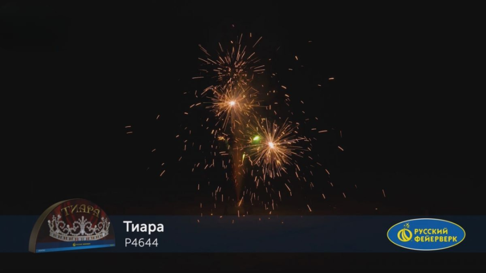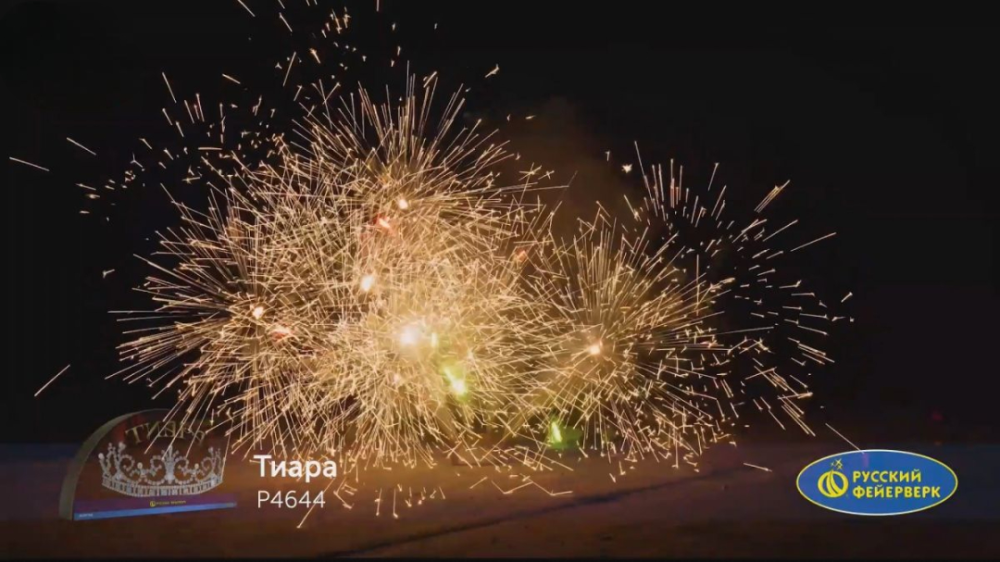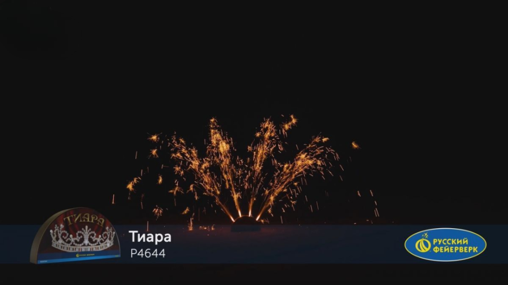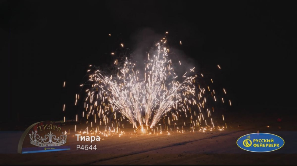 Фонтан "Тиара" веерного типа, работает одновременно вверх и в стороны. Мощные, разнообразные эффекты, включая поток серебряных и золотых искр, крупные зеленые и красные жемчужины, трещащие золотые вспышки и листья очень понравятся и детям, и взрослым.