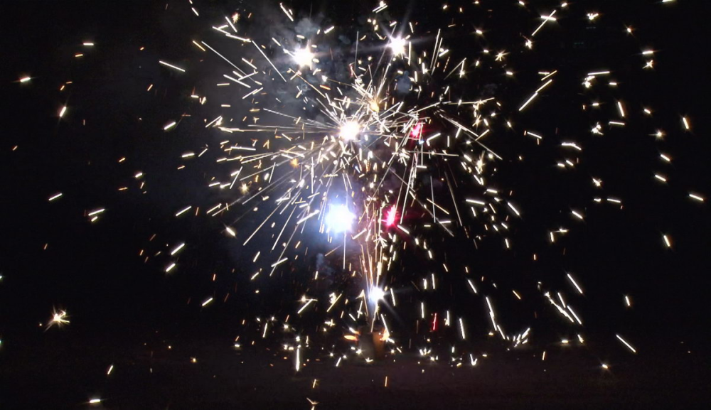6. Голубые и золотые трещащие огни, на боковых поверхностях начинают работать дополнительные пять фонтанов, фиолетовое пламя в основании и поток золотых огней.