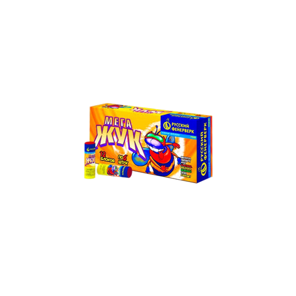 Мега-жук ведет себя аналогично "Веселому жуку" - петарда с жужжанием крутится на месте, образуя круг красного, желтого, зеленого огня.
