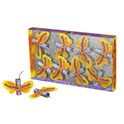 "Волшебный мотылек" - близкий аналог "Лунного цветка". Это летающий фейерверк, который взлетает, разбрасывая огненные искры, затем с громким жужжанием ускоряется. Вам несомненно понравится упаковка "Волшебного мотылька", которая сделана в виде характерной рамки с подложкой - в таких энтомологи коллекционируют бабочки. Начните свою коллекцию бабочек сегодня с "Волшебного мотылька"!